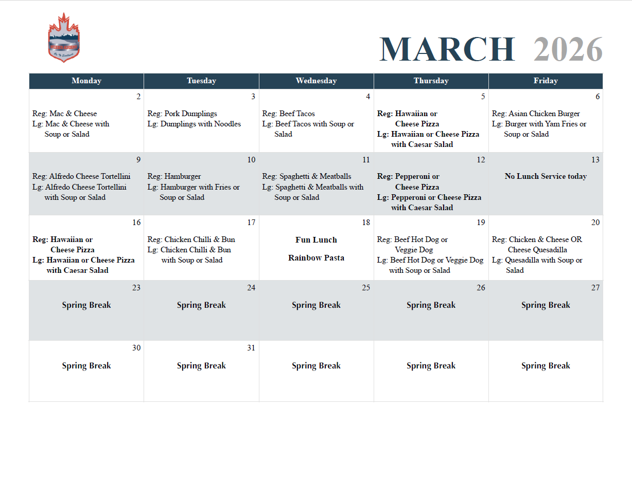 March Fun Lunch Menu (March 18): Rainbow Pasta with Tomato /or/ Alfredo Sauce and Strawberry Cake Box.